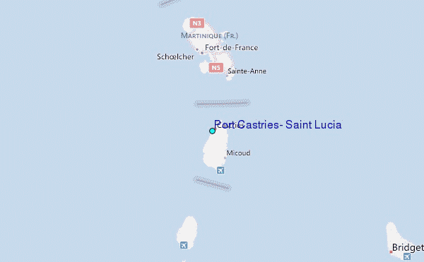 Use this relief map to navigate to tide stations, surf breaks and cities that are in the area of Port Castries, Saint Lucia.