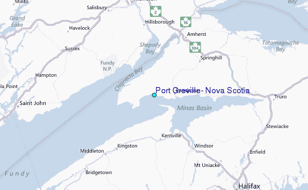 Use this relief map to navigate to tide stations, surf breaks and cities that are in the area of Port Greville, Nova Scotia.