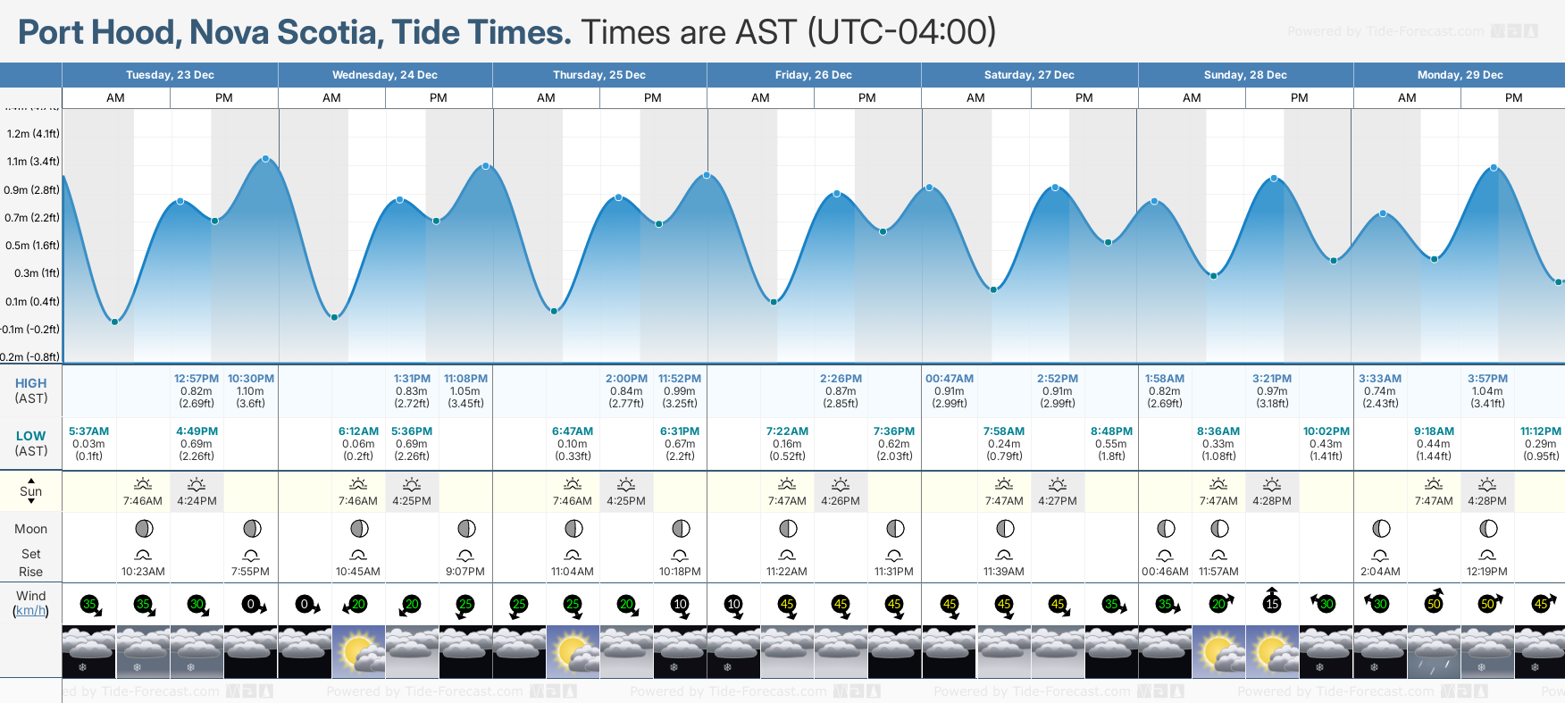 Tide chart for Port HoodShowing low and high tide times for the next 30 days at Port Hood. Tide Times are AST (UTC -4.0hrs).