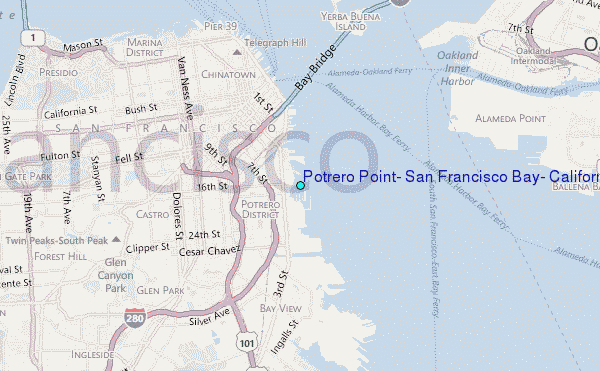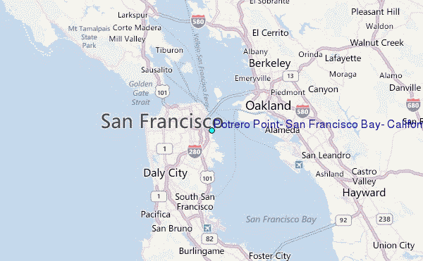 Use this relief map to navigate to tide stations, surf breaks and cities that are in the area of Potrero Point, San Francisco Bay, California.