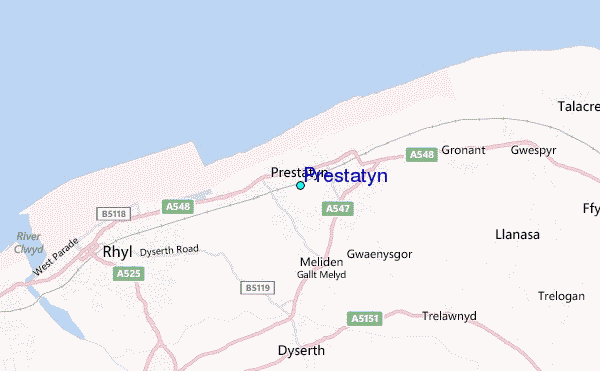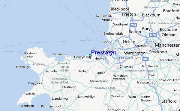 Use this relief map to navigate to tide stations, surf breaks and cities that are in the area of Prestatyn.