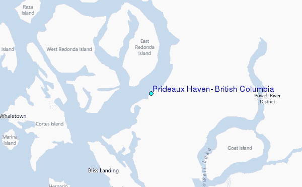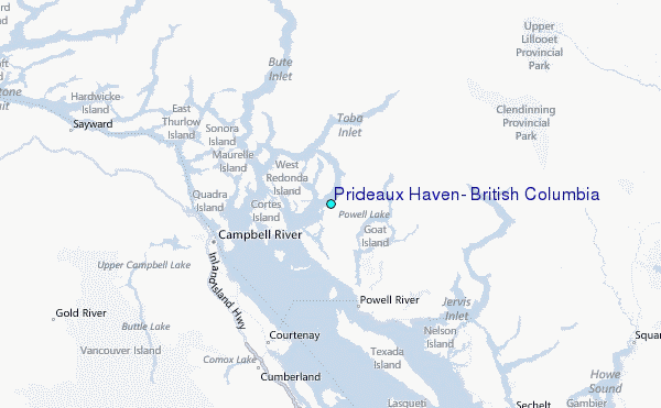 Use this relief map to navigate to tide stations, surf breaks and cities that are in the area of Prideaux Haven, British Columbia.