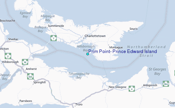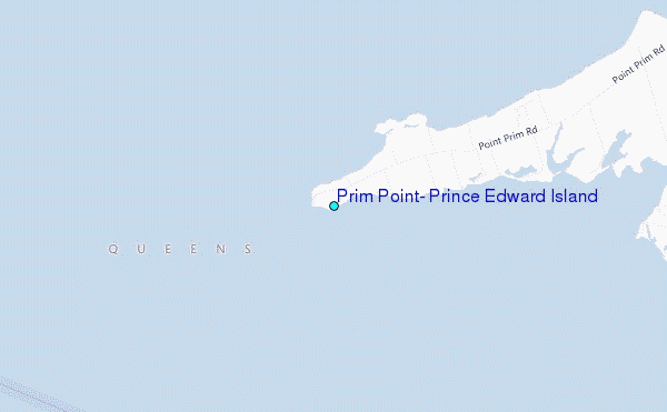 Use this relief map to navigate to tide stations, surf breaks and cities that are in the area of Prim Point, Prince Edward Island.