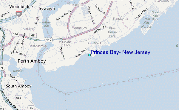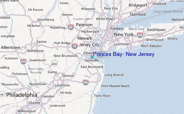 Use this relief map to navigate to tide stations, surf breaks and cities that are in the area of Princes Bay, New Jersey.