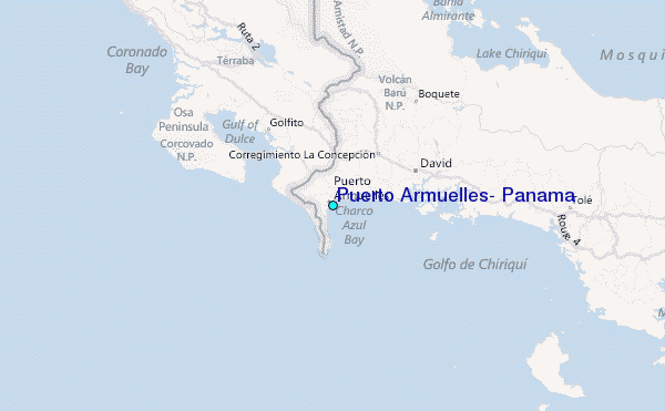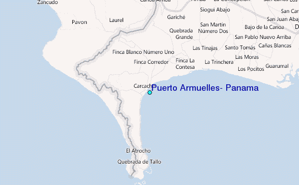 Use this relief map to navigate to tide stations, surf breaks and cities that are in the area of Puerto Armuelles, Panama.