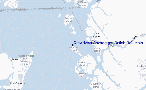 Use this relief map to navigate to tide stations, surf breaks and cities that are in the area of Qlawdzeet Anchorage, British Columbia.