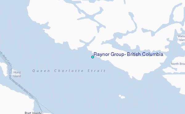 Use this relief map to navigate to tide stations, surf breaks and cities that are in the area of Raynor Group, British Columbia.
