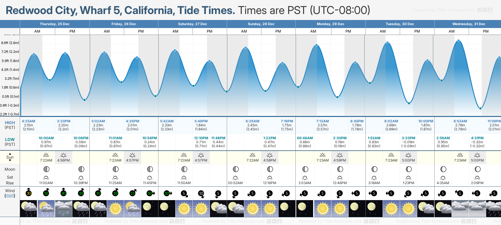 Tide Times are PST (UTC -8.0hrs). Last Spring High Tide at Redwood City, Wharf 5 was on Sun 21 Dec (height: 2.51m 8.2ft). Next high Spring Tide at Redwood City, Wharf 5 will be on Fri 02 Jan (height: 2.85m 9.4ft).