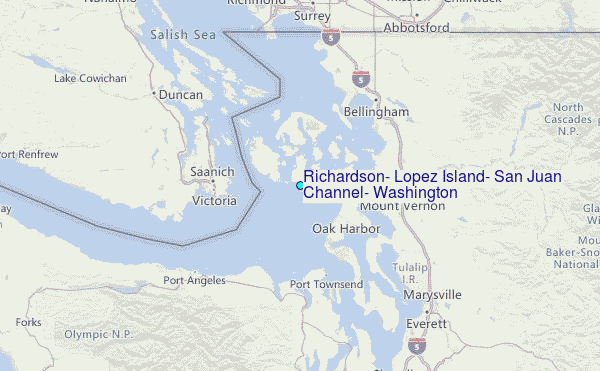 Use this relief map to navigate to tide stations, surf breaks and cities that are in the area of Richardson, Lopez Island, San Juan Channel, Washington.
