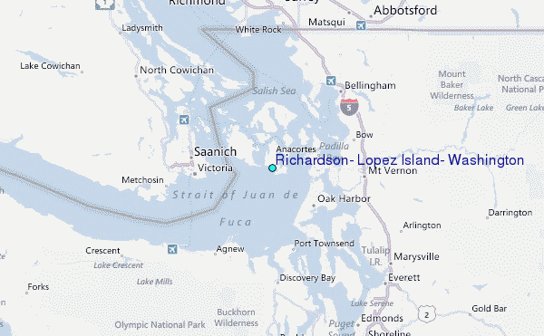 Use this relief map to navigate to tide stations, surf breaks and cities that are in the area of Richardson, Lopez Island, Washington.