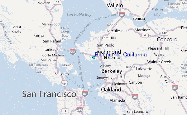 Use this relief map to navigate to tide stations, surf breaks and cities that are in the area of Richmond, California.
