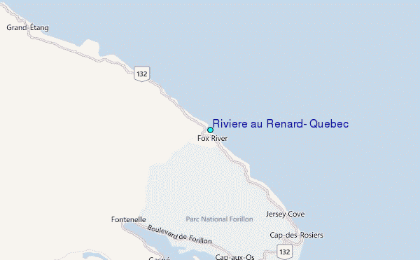 Use this relief map to navigate to tide stations, surf breaks and cities that are in the area of Riviere au Renard, Quebec.