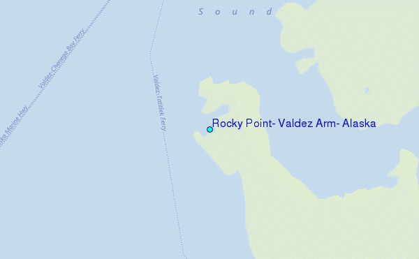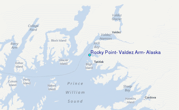 Use this relief map to navigate to tide stations, surf breaks and cities that are in the area of Rocky Point, Valdez Arm, Alaska.