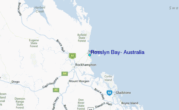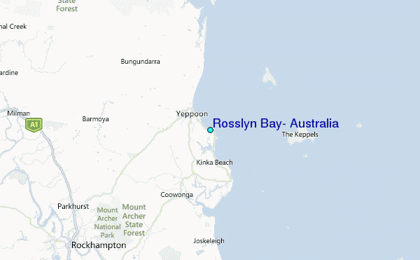 Use this relief map to navigate to tide stations, surf breaks and cities that are in the area of Rosslyn Bay, Australia.