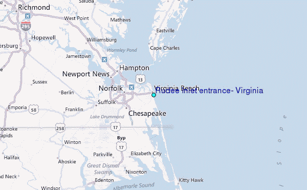 Use this relief map to navigate to tide stations, surf breaks and cities that are in the area of Rudee Inlet entrance, Virginia.