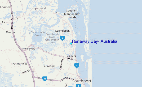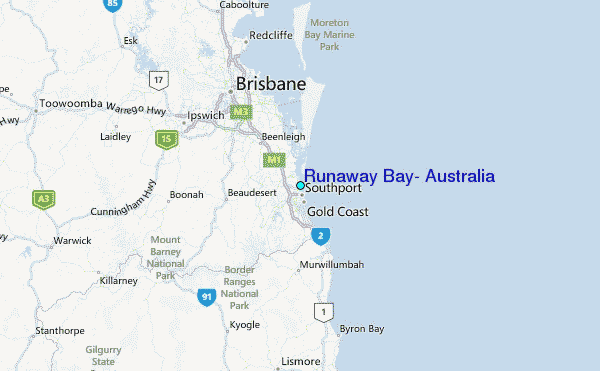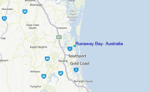 Use this relief map to navigate to tide stations, surf breaks and cities that are in the area of Runaway Bay, Australia.