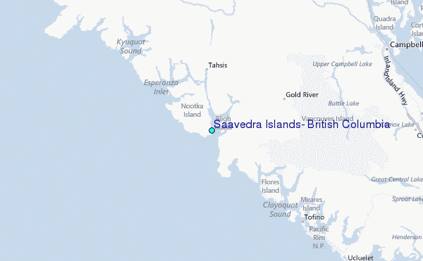 Use this relief map to navigate to tide stations, surf breaks and cities that are in the area of Saavedra Islands, British Columbia.