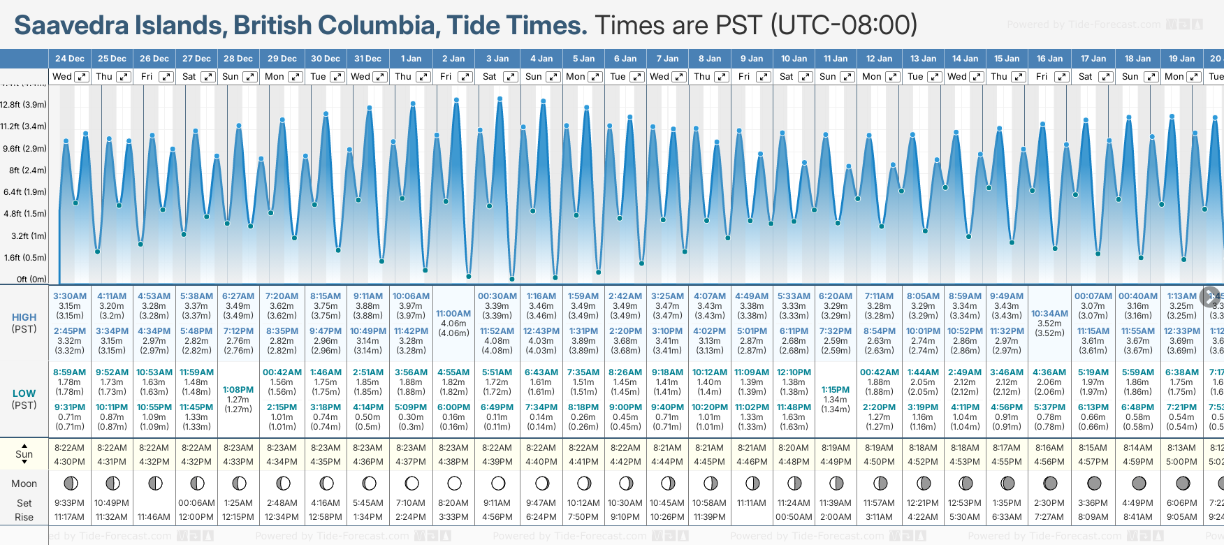Tide Times are PST (UTC -8.0hrs). Last Spring High Tide at Saavedra Islands was on Sun 21 Dec (height: 3.56m 11.7ft). Next high Spring Tide at Saavedra Islands will be on Sat 03 Jan (height: 4.08m 13.4ft).
