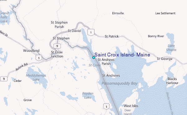 Use this relief map to navigate to tide stations, surf breaks and cities that are in the area of Saint Croix Island, Maine.
