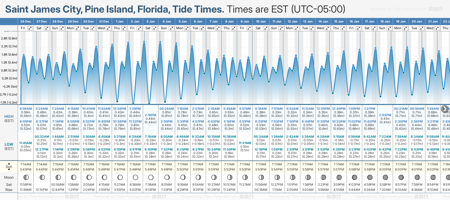 December and January Tide charts for Saint James City: The tide charts below show the height, time and date of high and low tides for the next 30 days.