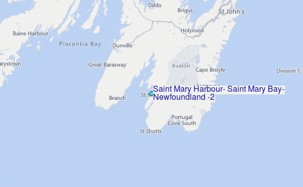 Use this relief map to navigate to tide stations, surf breaks and cities that are in the area of Saint Mary Harbour, Saint Mary Bay, Newfoundland (2).