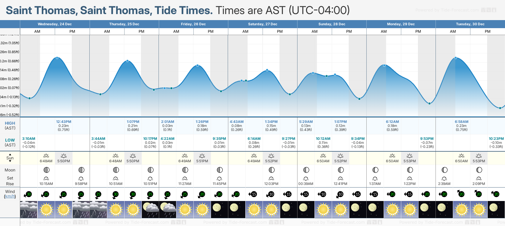 Tide chart for Saint Thomas, Saint ThomasShowing low and high tide times for the next 30 days at Saint Thomas, Saint Thomas. Tide Times are AST (UTC -4.0hrs).