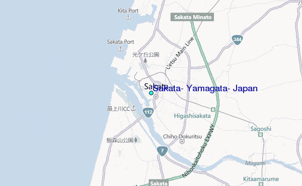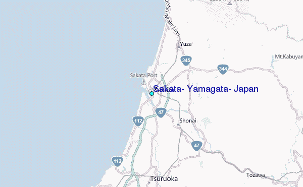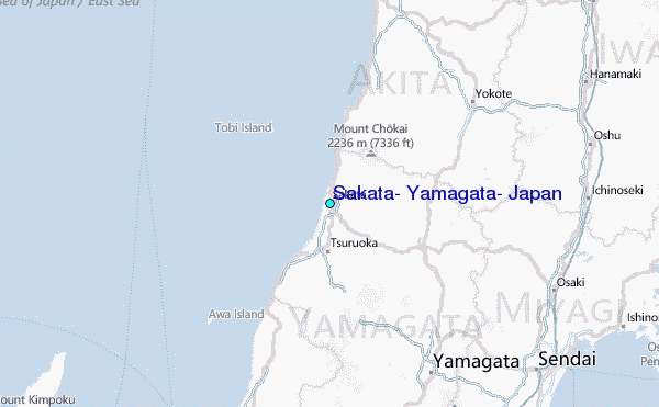 Use this relief map to navigate to tide stations, surf breaks and cities that are in the area of Sakata, Yamagata, Japan.