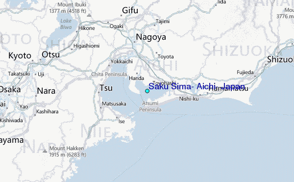 Use this relief map to navigate to tide stations, surf breaks and cities that are in the area of Saku Sima, Aichi, Japan.