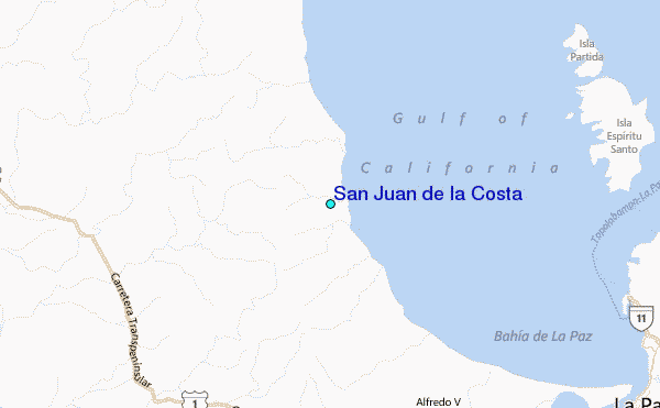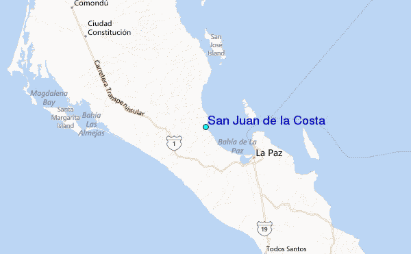 Use this relief map to navigate to tide stations, surf breaks and cities that are in the area of San Juan de la Costa.
