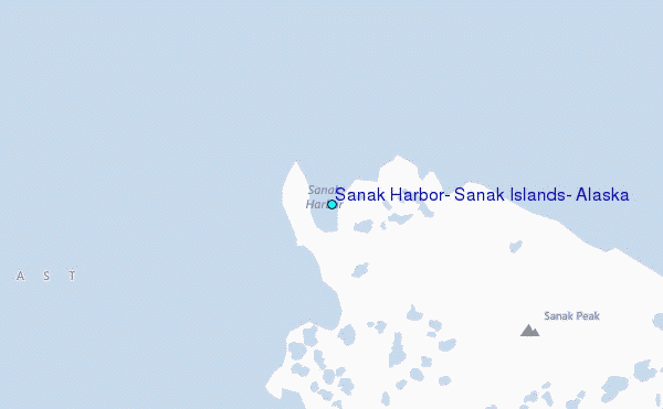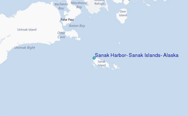 Use this relief map to navigate to tide stations, surf breaks and cities that are in the area of Sanak Harbor, Sanak Islands, Alaska.