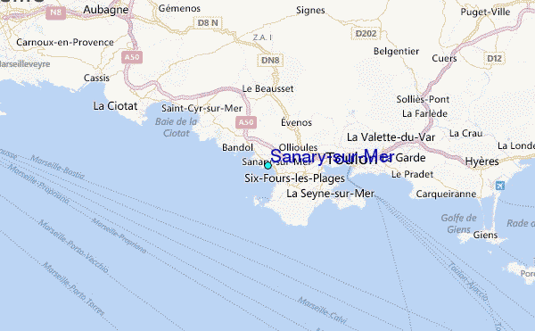 Use this relief map to navigate to tide stations, surf breaks and cities that are in the area of Sanary-sur-Mer.
