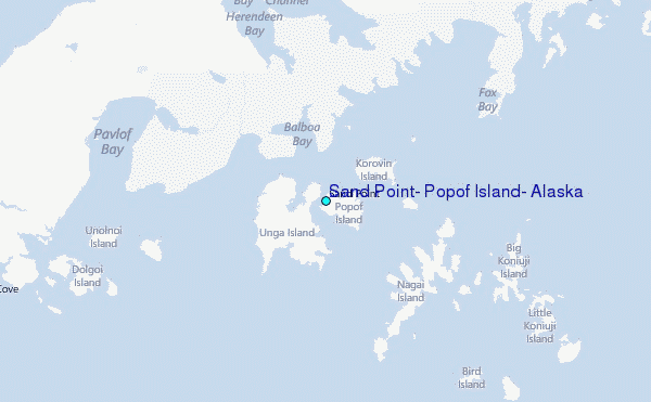 Use this relief map to navigate to tide stations, surf breaks and cities that are in the area of Sand Point, Popof Island, Alaska.