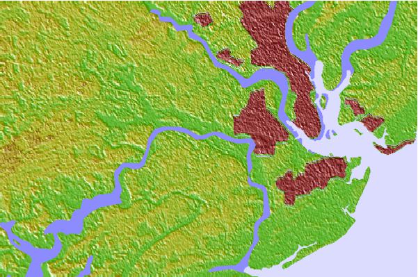 Use this relief map to navigate to tide stations, surf breaks and cities that are in the area of Sandblasters, Pennys Creek, Stono River, South Carolina.