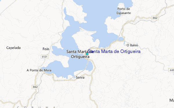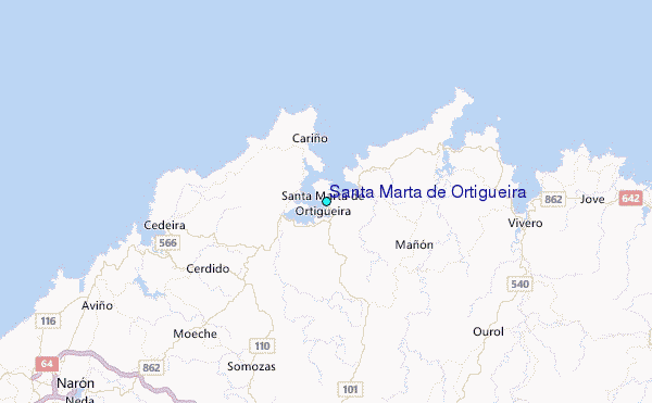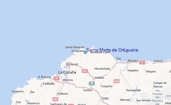 Use this relief map to navigate to tide stations, surf breaks and cities that are in the area of Santa Marta de Ortigueira.