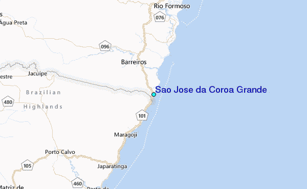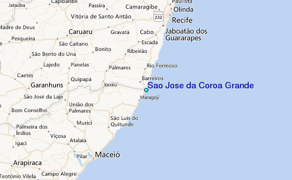 Use this relief map to navigate to tide stations, surf breaks and cities that are in the area of Sao Jose da Coroa Grande.