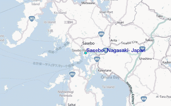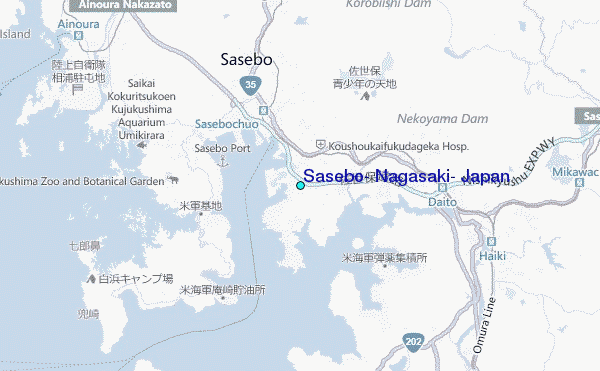 Use this relief map to navigate to tide stations, surf breaks and cities that are in the area of Sasebo, Nagasaki, Japan.