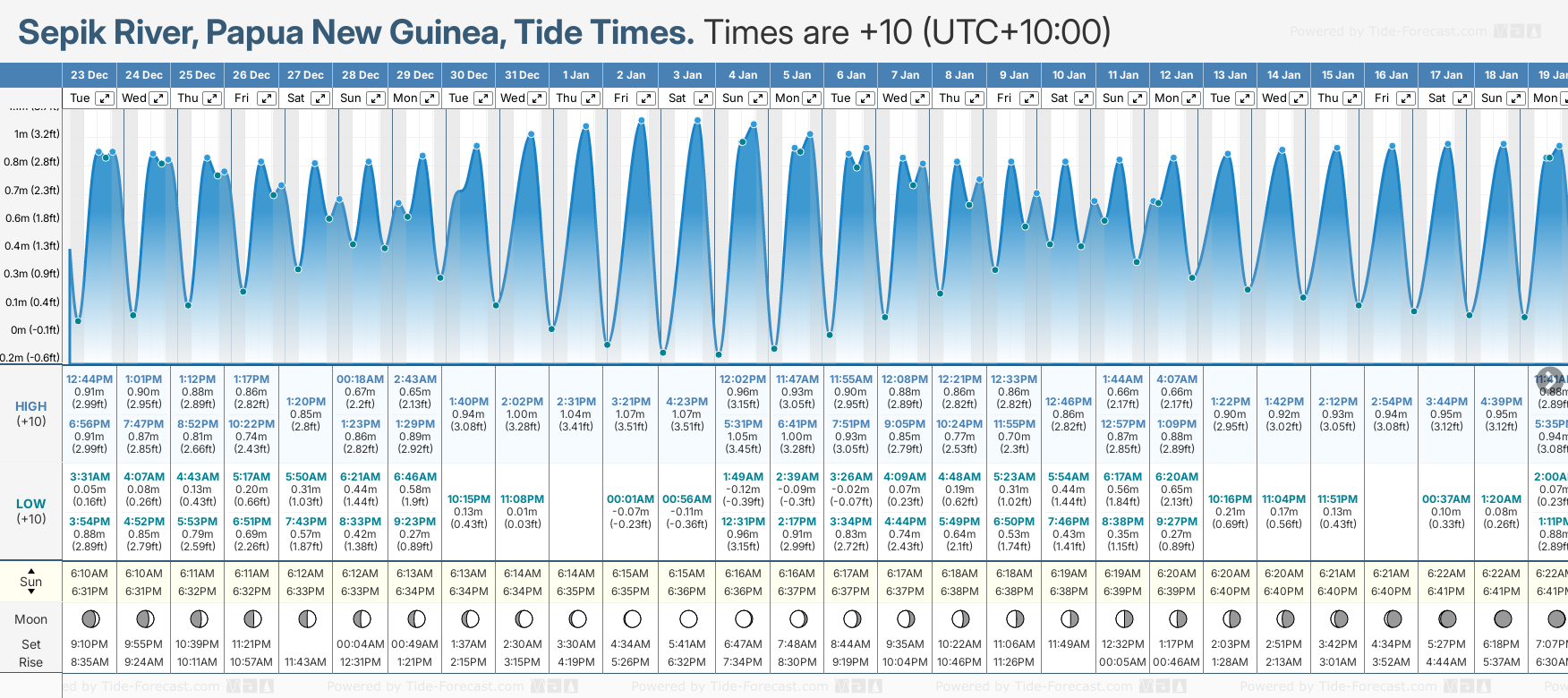 December and January Tide charts for Sepik River: The tide charts below show the height, time and date of high and low tides for the next 30 days.