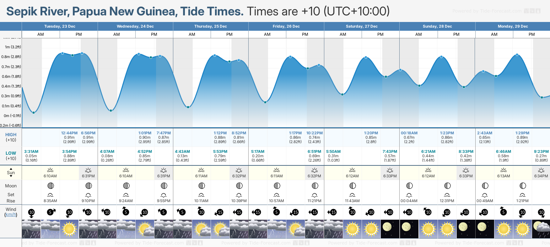 Tide chart for Sepik RiverShowing low and high tide times for the next 30 days at Sepik River. Tide Times are +10 (UTC +10.0hrs).