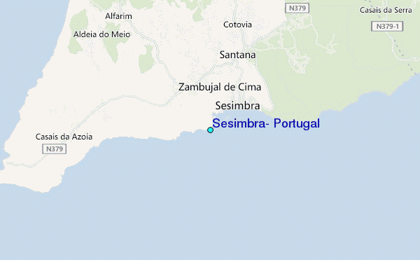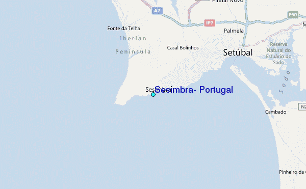 Use this relief map to navigate to tide stations, surf breaks and cities that are in the area of Sesimbra, Portugal.