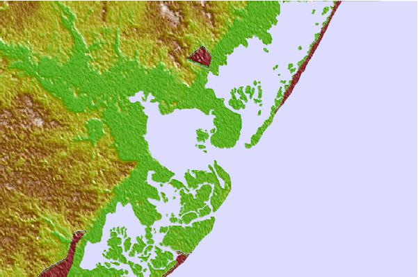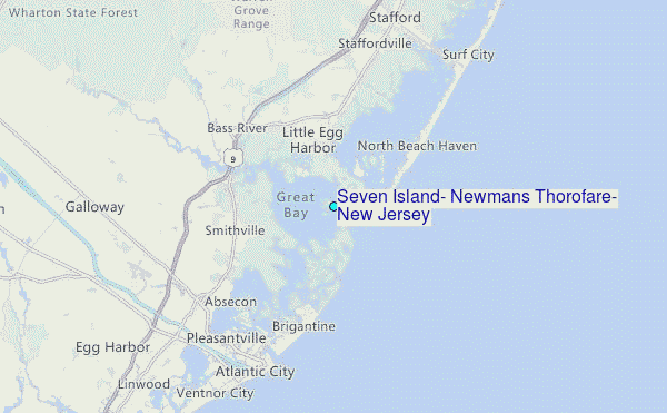 Use this relief map to navigate to tide stations, surf breaks and cities that are in the area of Seven Island, Newmans Thorofare, New Jersey.