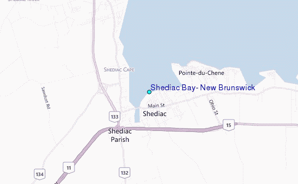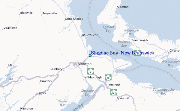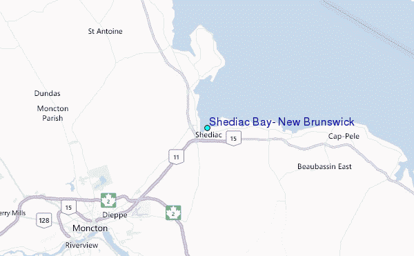 Use this relief map to navigate to tide stations, surf breaks and cities that are in the area of Shediac Bay, New Brunswick.