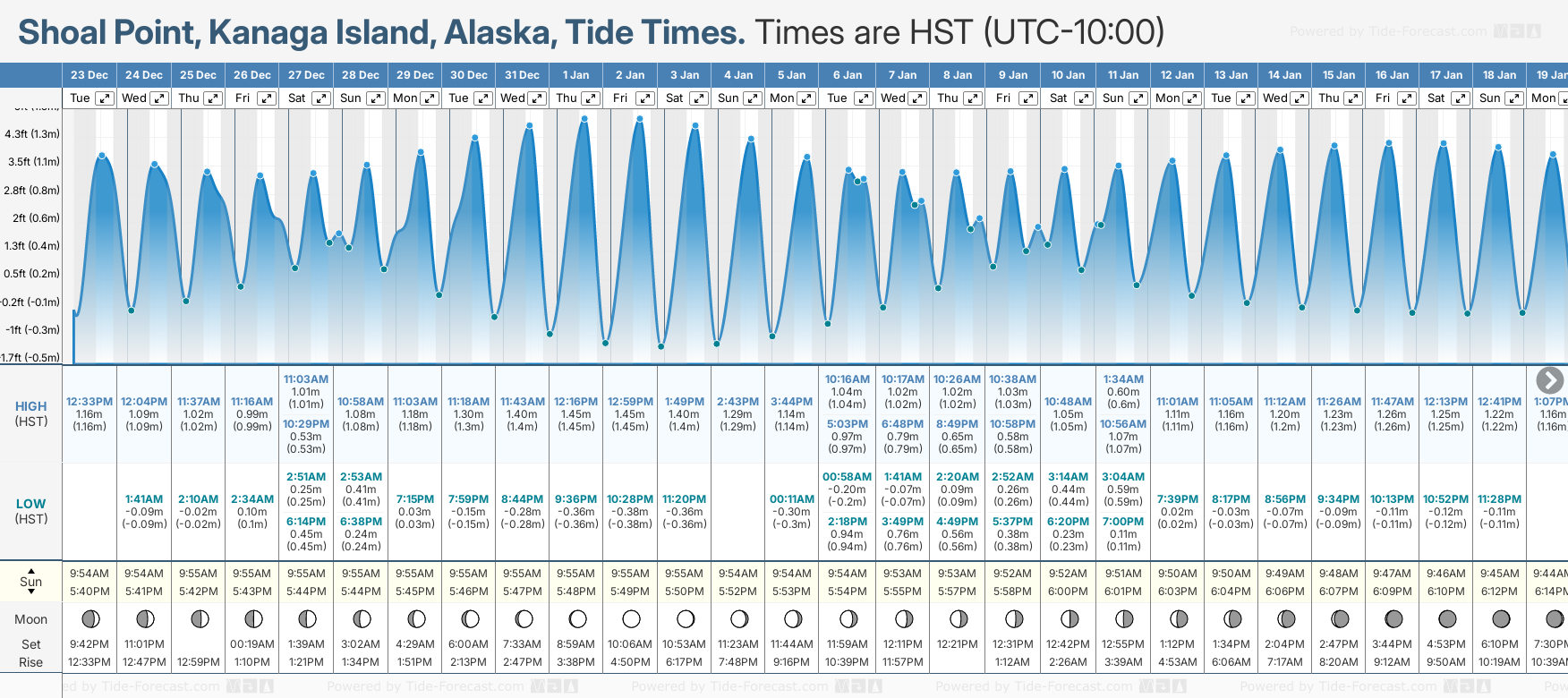 December and January Tide charts for Shoal Point, Kanaga Island: The tide charts below show the height, time and date of high and low tides for the next 30 days.