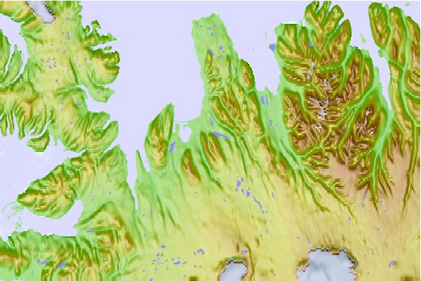 Use this relief map to navigate to tide stations, surf breaks and cities that are in the area of Skagaströnd, Iceland.
