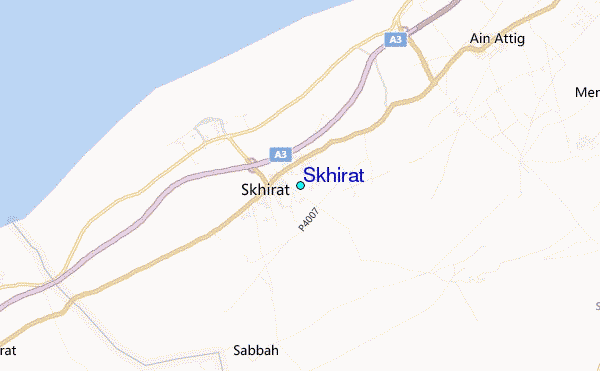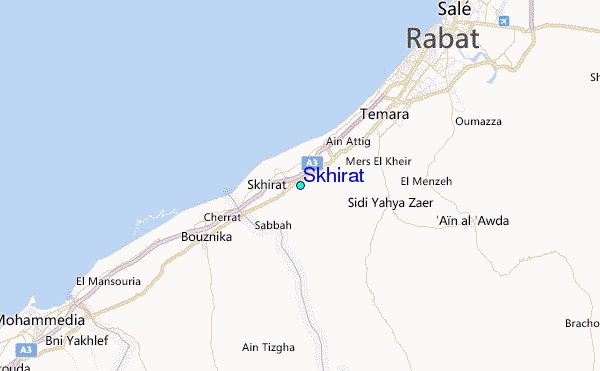 Use this relief map to navigate to tide stations, surf breaks and cities that are in the area of Skhirat.