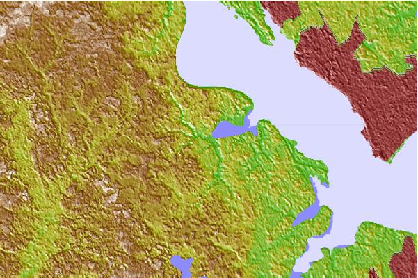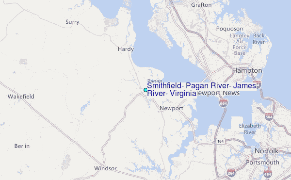 Use this relief map to navigate to tide stations, surf breaks and cities that are in the area of Smithfield, Pagan River, James River, Virginia.
