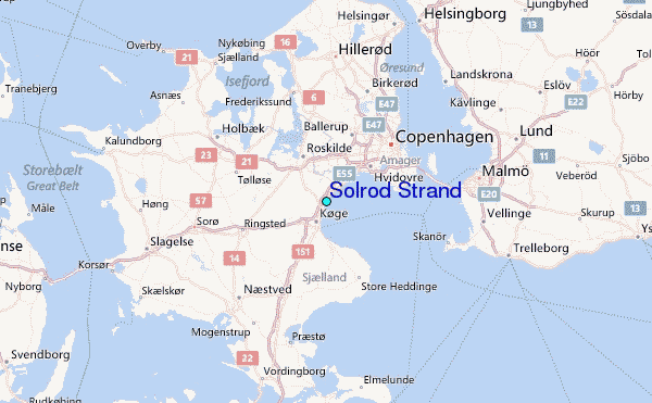 Use this relief map to navigate to tide stations, surf breaks and cities that are in the area of Solrod Strand.