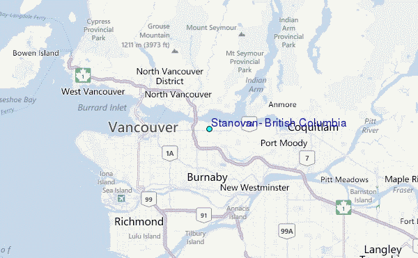 Use this relief map to navigate to tide stations, surf breaks and cities that are in the area of Stanovan, British Columbia.