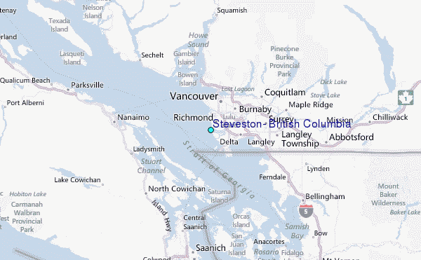 Use this relief map to navigate to tide stations, surf breaks and cities that are in the area of Steveston, British Columbia.
