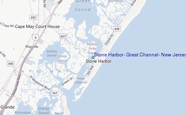 Use this relief map to navigate to tide stations, surf breaks and cities that are in the area of Stone Harbor, Great Channel, New Jersey.