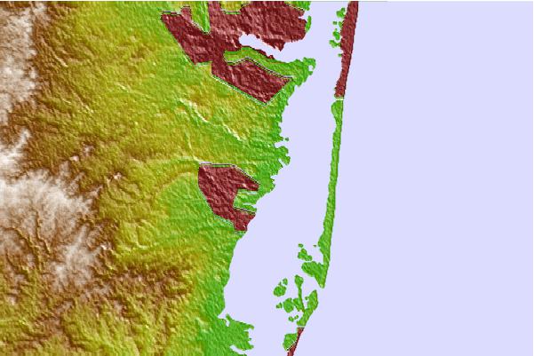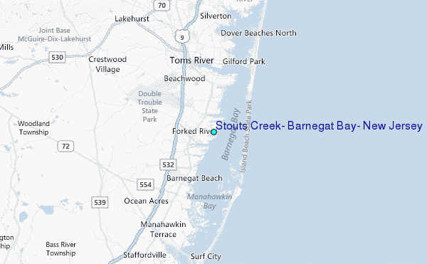 Use this relief map to navigate to tide stations, surf breaks and cities that are in the area of Stouts Creek, Barnegat Bay, New Jersey.